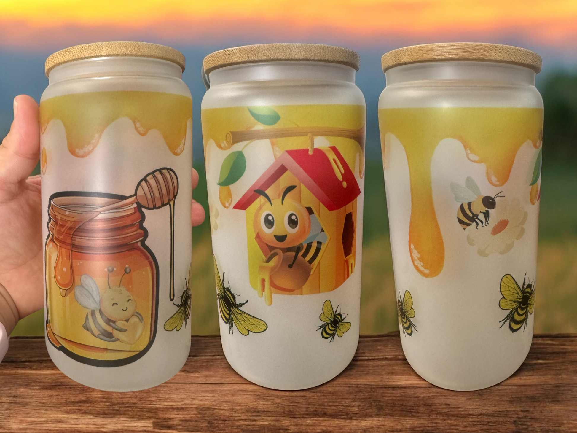Frosted glass cup 16oz,Iced Coffee Cup, Mom iced coffee cup, Glass Cup With Lid And Straw, Bee lover, Glass Tumbler