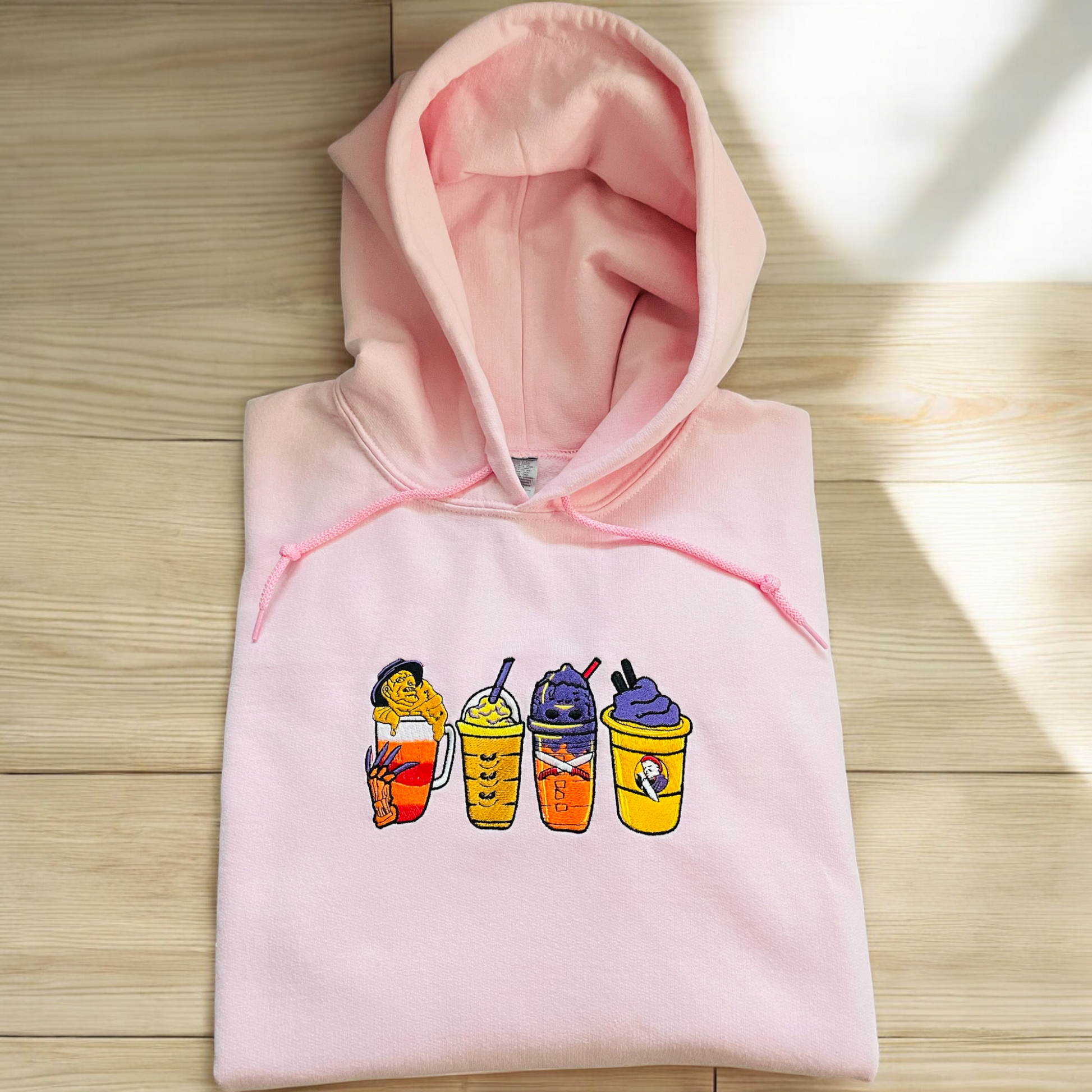 "Stay warm and stylish this Halloween with our embroidered hoodies featuring a trendy iced coffee design. Made with high-quality materials, you'll be comfortable and fashionable all season long. Perfect for any coffee lover looking to show off their Halloween spirit."