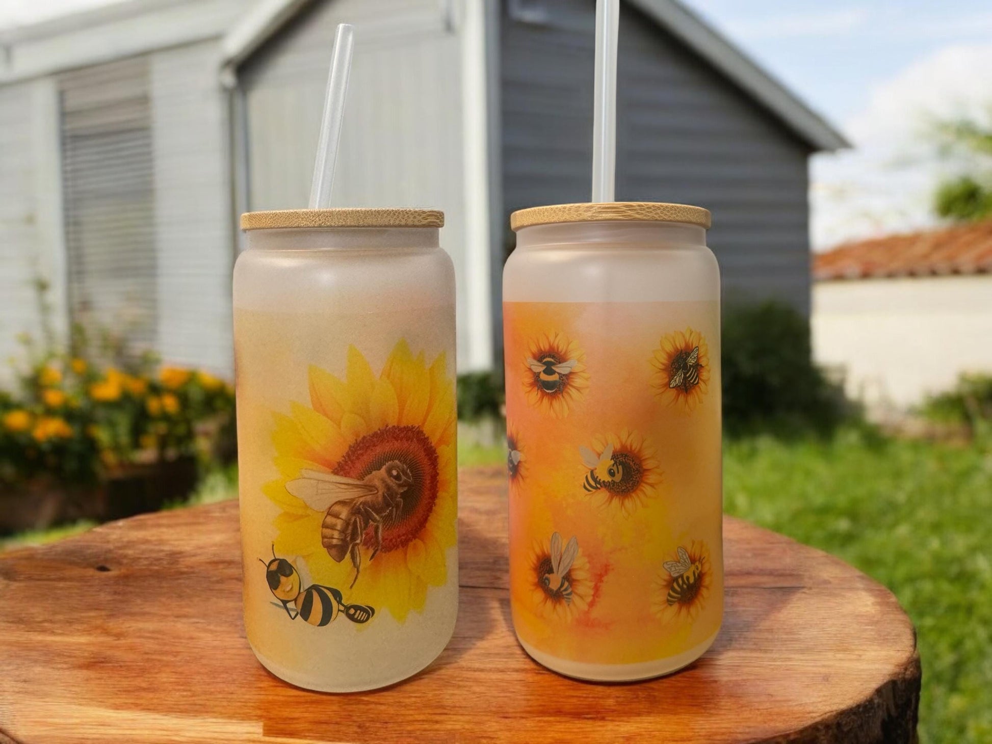 Elevate your beverage game with our 16oz Frosted Glass Iced Coffee Cup, adorned with a delightful Bees & Honey design. This glass tumbler includes a lid and straw for convenience and eco-friendliness. Perfect for bee enthusiasts, stay chic and sustainable with every sip.
