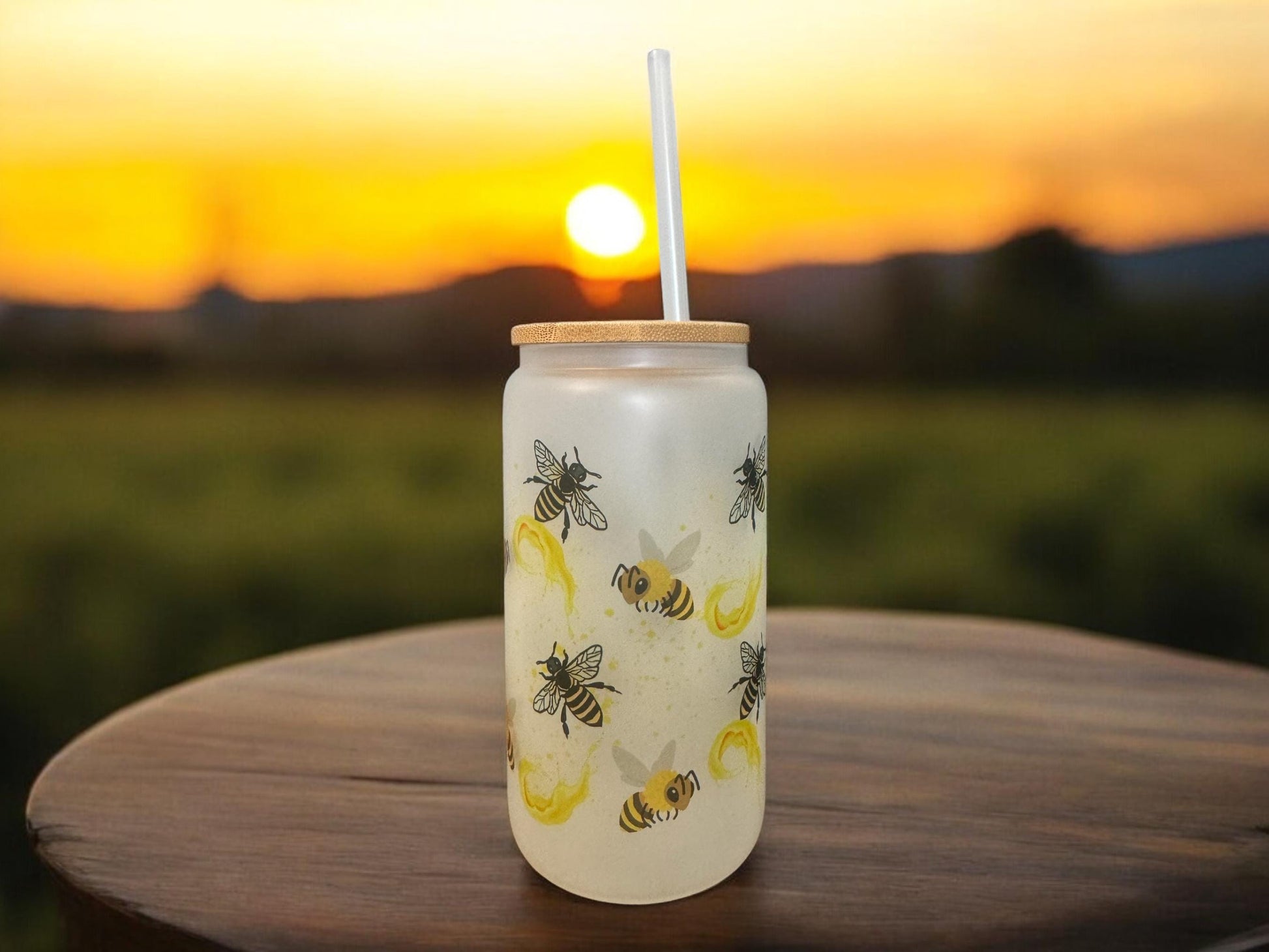 Frosted glass cup 16oz, Iced Coffee Cup, Bees & Honey - Glass Cup with Lid and Straw, Bee lover, Glass Tumbler