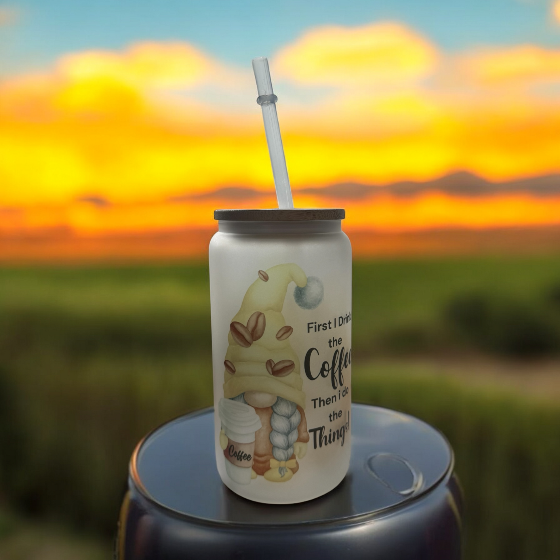 Frosted glass cup 16oz, Iced Coffee Cup, First coffee - Glass Cup with Lid and Straw, Glass Tumbler