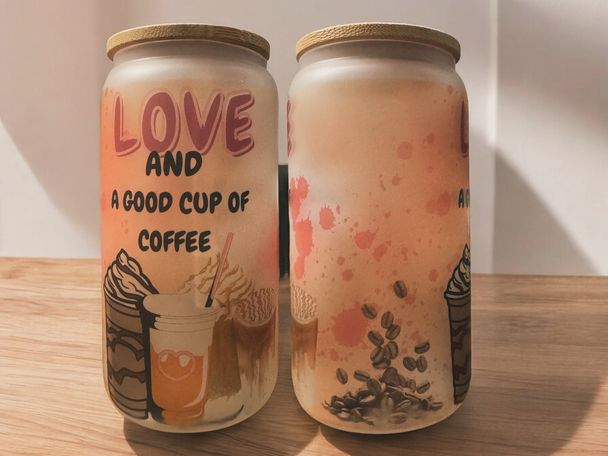Frosted glass cup 16oz, Iced Coffee Cup, Love and a good cup of coffee, Glass Cup with Lid and Straw, Coffee lover, Glass Tumbler