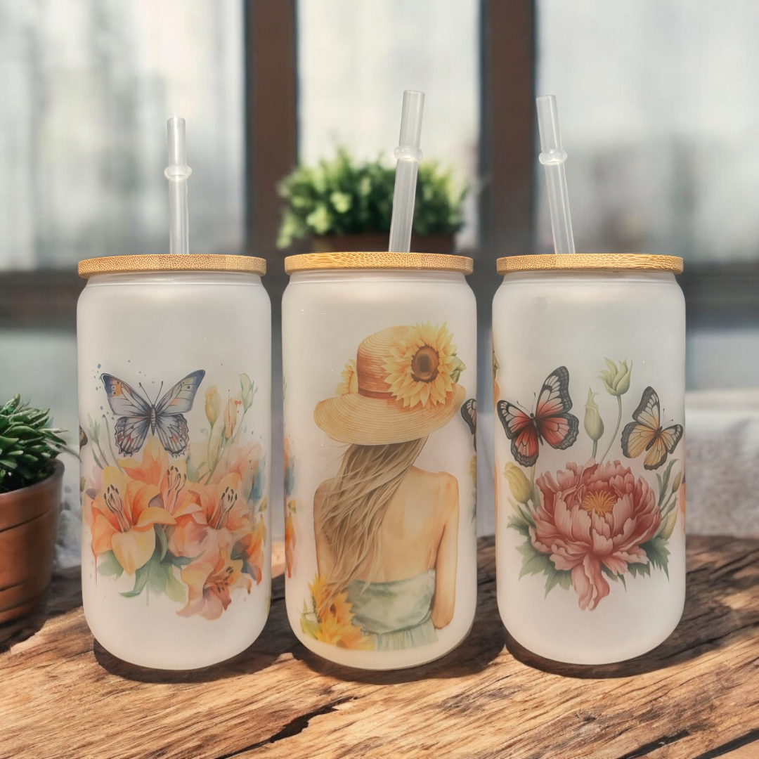 "Drink in style with this 16oz frosted glass cup! It comes with a convenient lid and straw for spill-proof sipping. Adorned with a beautiful flower and butterfly design, it's a must-have for any nature lover. And with sublimation printing, the colors will stay vibrant for endless enjoyment."
