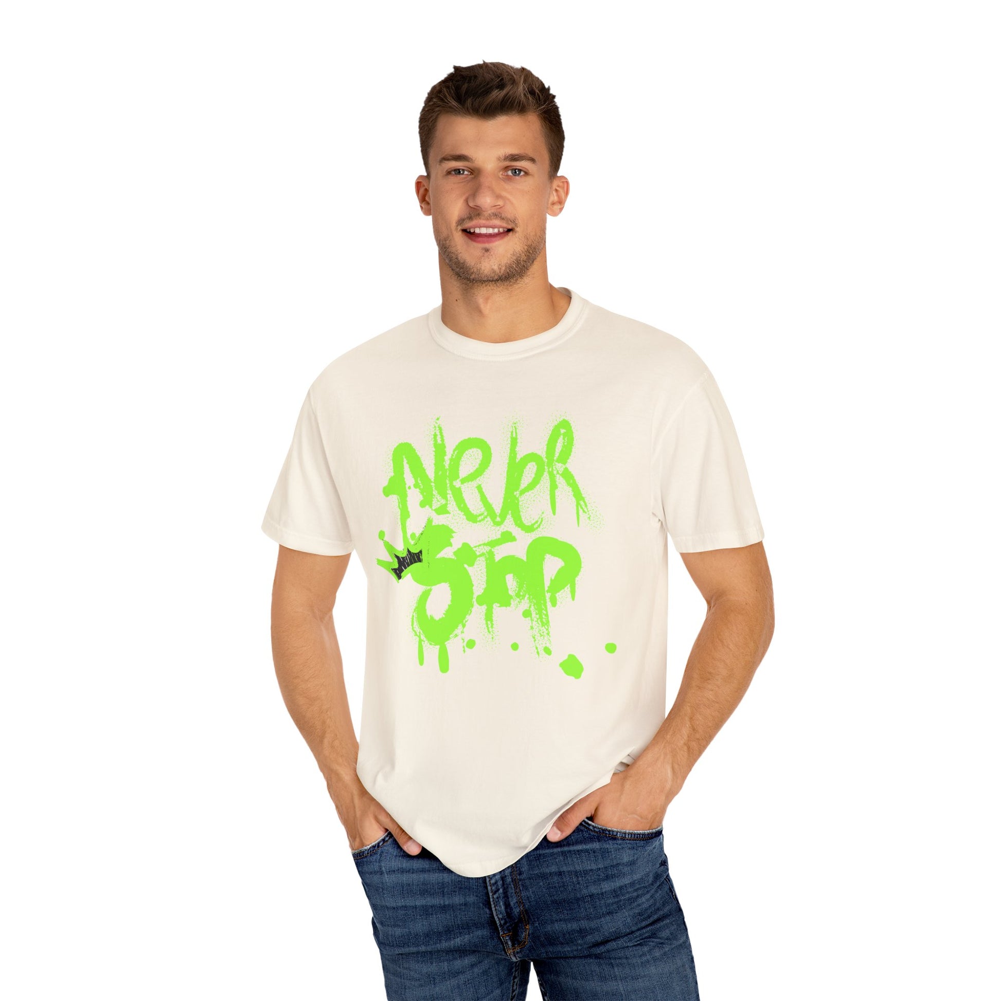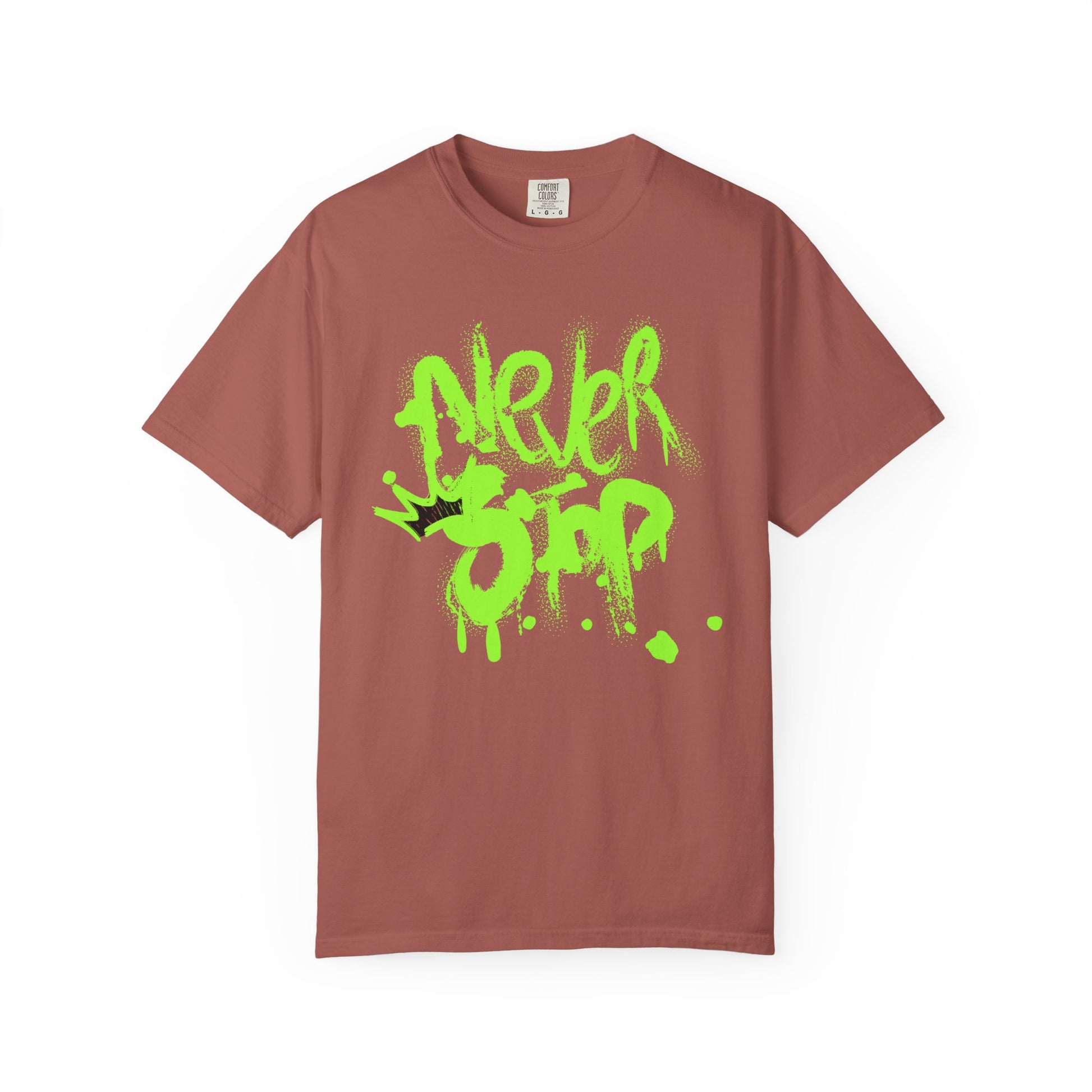 Urban Graffiti Tee - Never Stop, Fun Streetwear for Teens, Unisex Casual Shirt. This trendy and comfortable T-shirt is perfect for teens looking for a casual and stylish streetwear look. The urban graffiti design adds a fun and edgy vibe to any outfit, making it great for everyday wear or hanging out with friends. Ideal for teenagers and young adults, this tee is relevant for streetwear fashion, casual hangouts, and urban-inspired events.